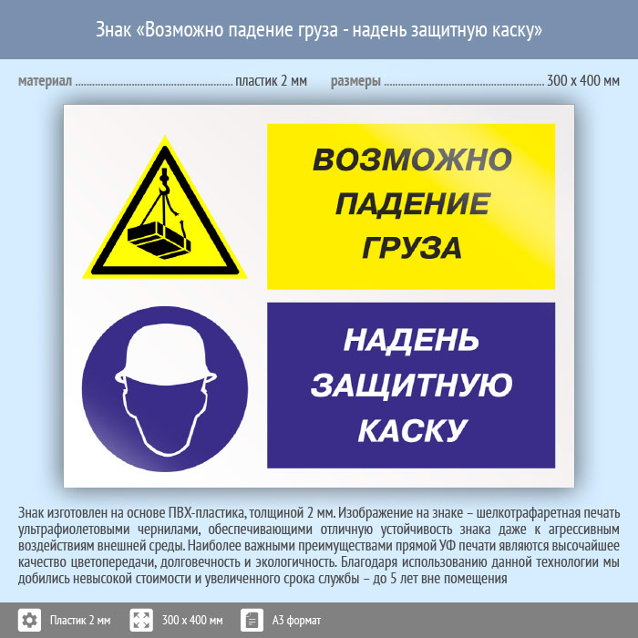 Знак «Возможно падение груза - надень защитную каску», КЗ-17 (пластик, 400х300 мм) в Москве купить