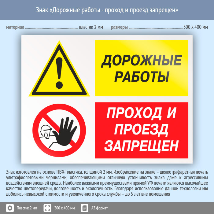Знак «Дорожные работы - проход и проезд запрещен», КЗ-20 (пластик, 400х300 мм) в Москве купить