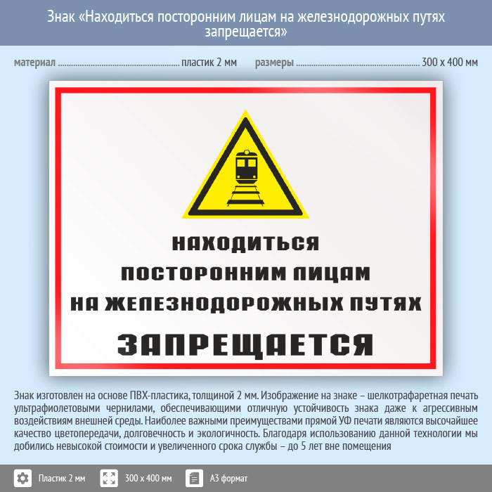Знак «Находиться посторонним лицам на железнодорожных путях запрещается», КЗ-24 (пластик, 400х300 мм) в Москве купить