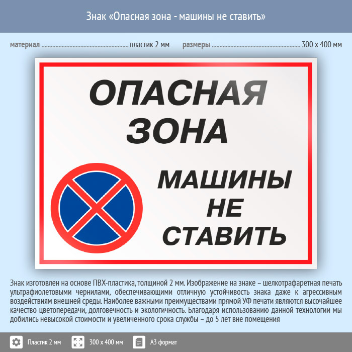 Знак «Опасная зона - машины не ставить», КЗ-32 (пластик, 400х300 мм) в Москве купить