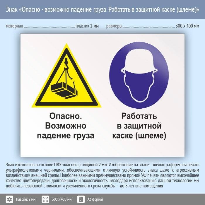 Знак «Опасно - возможно падение груза. Работать в защитной каске (шлеме)», КЗ-34 (пластик, 400х300 мм) в Москве купить