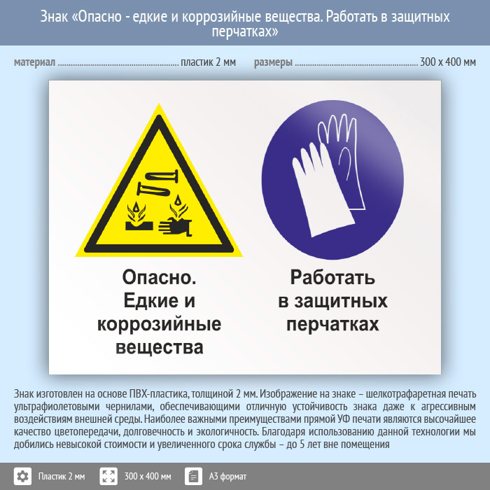 Знак «Опасно - едкие и коррозийные вещества. Работать в защитных перчатках», КЗ-36 (пластик, 400х300 мм) в Москве купить
