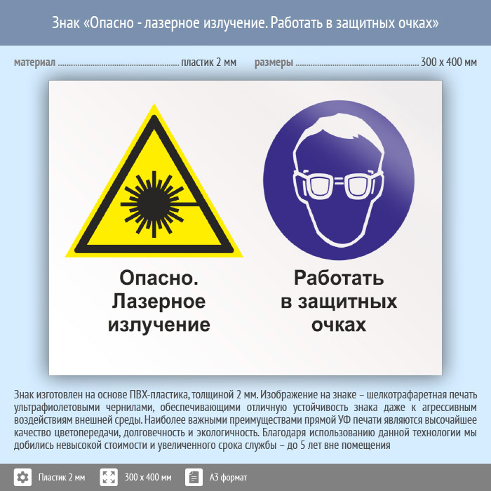 Знак «Опасно - лазерное излучение. Работать в защитных очках», КЗ-38 (пластик, 400х300 мм) в Москве купить