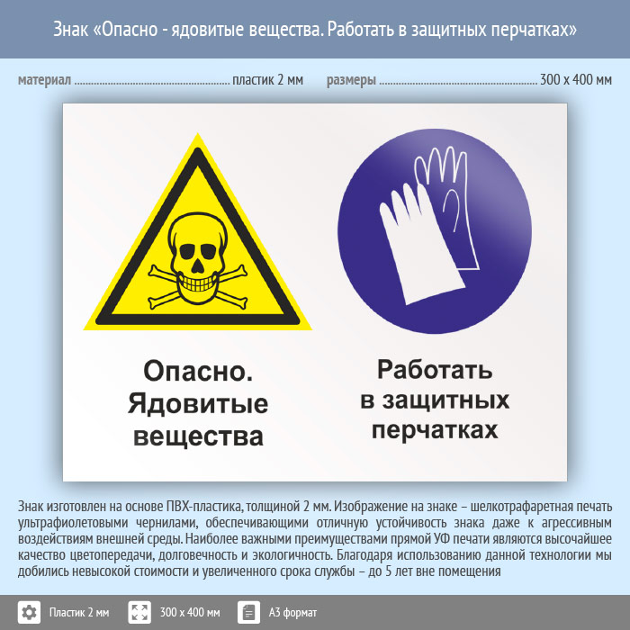 Знак «Опасно - ядовитые вещества. Работать в защитных перчатках», КЗ-43 (пластик, 400х300 мм) в Москве купить