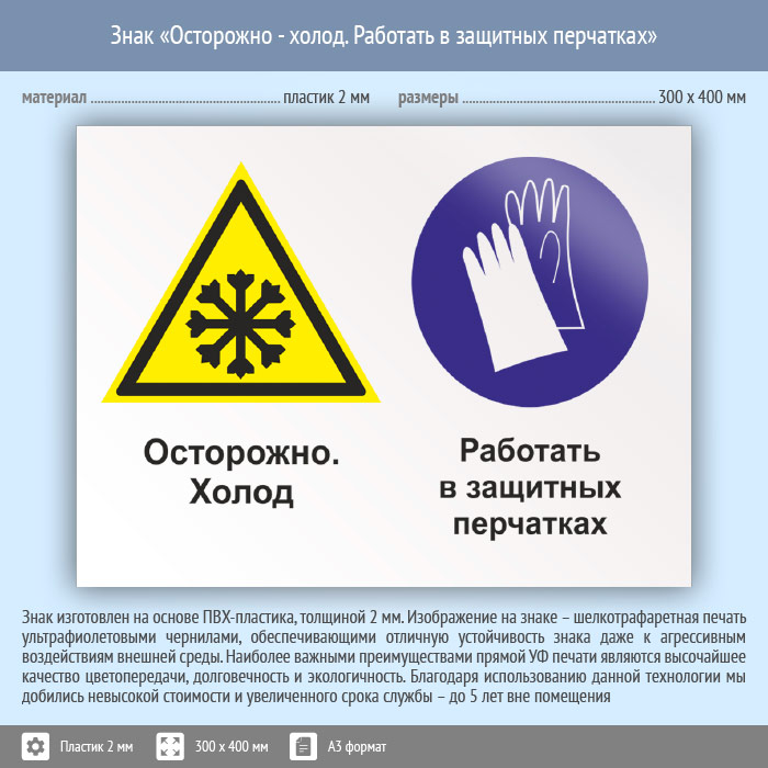 Знак «Осторожно - холод. Работать в защитных перчатках», КЗ-59 (пластик, 400х300 мм) в Москве купить