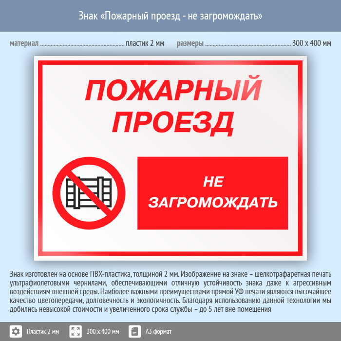 Знак «Пожарный проезд - не загромождать», КЗ-67 (пластик, 400х300 мм) в Москве купить
