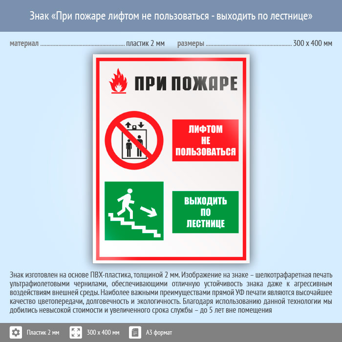 Знак «При пожаре лифтом не пользоваться - выходить по лестнице», КЗ-73 (пластик, 300х400 мм) в Москве купить