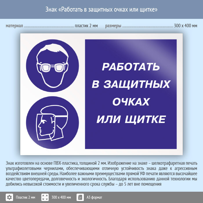 Знак «Работать в защитных очках или щитке», КЗ-80 (пластик, 400х300 мм) в Москве купить