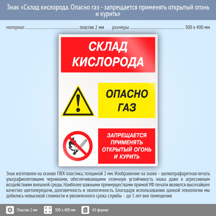 Знак «Склад кислорода. Опасно газ - запрещается применять открытый огонь и курить», КЗ-85 (пластик, 300х400 мм) в Москве купить