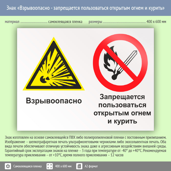 Знак «Взрывоопасно - запрещается пользоваться открытым огнем и курить», КЗ-07 (пленка, 600х400 мм) в Москве купить