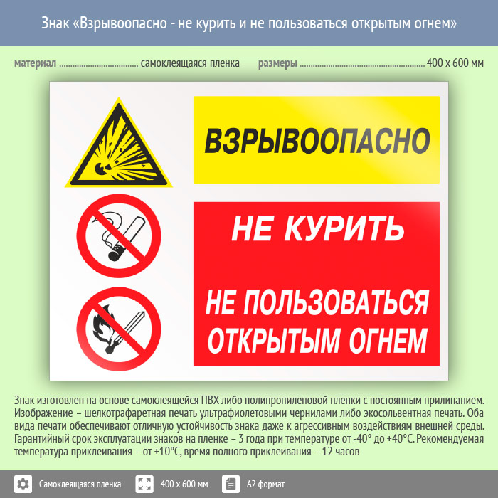 Знак «Взрывоопасно - не курить и не пользоваться открытым огнем», КЗ-09 (пленка, 600х400 мм) в Москве купить