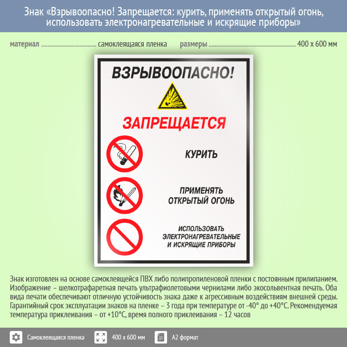 Знак «Взрывоопасно! Запрещается: курить, применять открытый огонь, использовать электронагревательные и искрящие приборы», КЗ-10 (пленка, 400х600 мм) в Москве купить