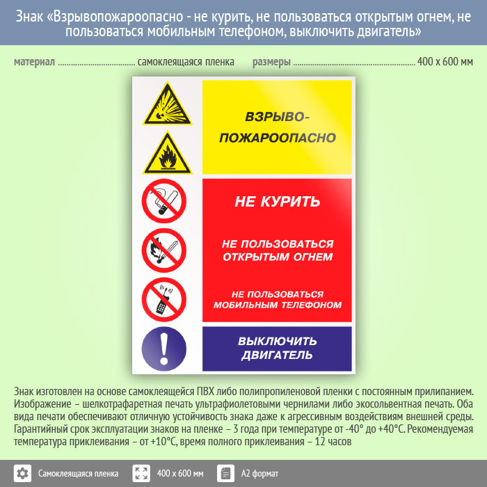 Знак «Взрывопожароопасно - не курить, не пользоваться открытым огнем, не пользоваться мобильным телефоном, выключить двигатель», КЗ-11 (пленка, 400х600 мм) в Москве купить