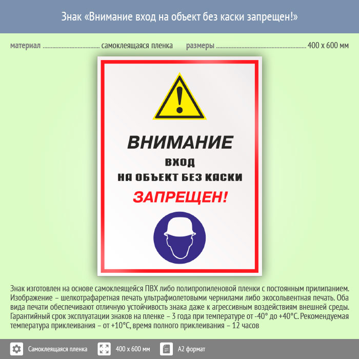 Знак «Внимание вход на объект без каски запрещен!», КЗ-13 (пленка, 400х600 мм) в Москве купить