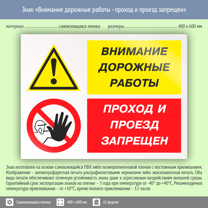 Знак «Внимание дорожные работы - проход и проезд запрещен», КЗ-14 (пленка, 600х400 мм) в Москве купить