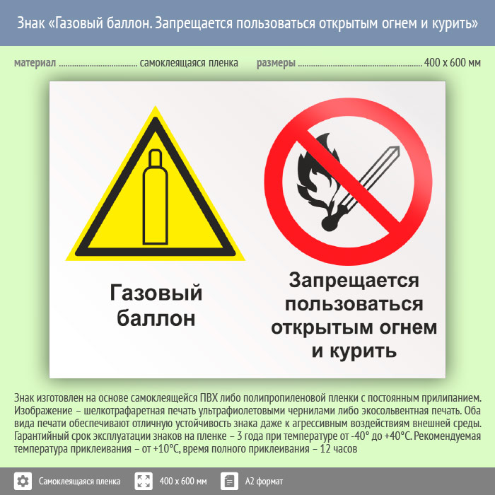 Знак «Газовый баллон. Запрещается пользоваться открытым огнем и курить», КЗ-19 (пленка, 600х400 мм) в Москве купить