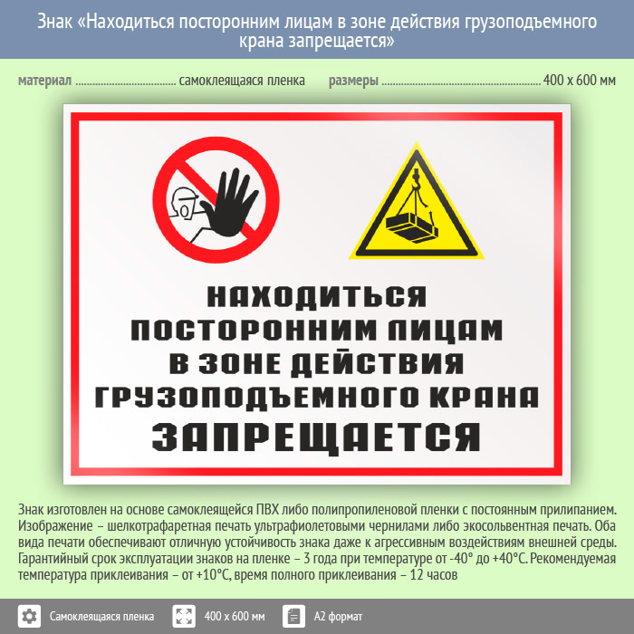 Знак «Находиться посторонним лицам в зоне действия грузоподъемного крана запрещается», КЗ-23 (пленка, 600х400 мм) в Москве купить