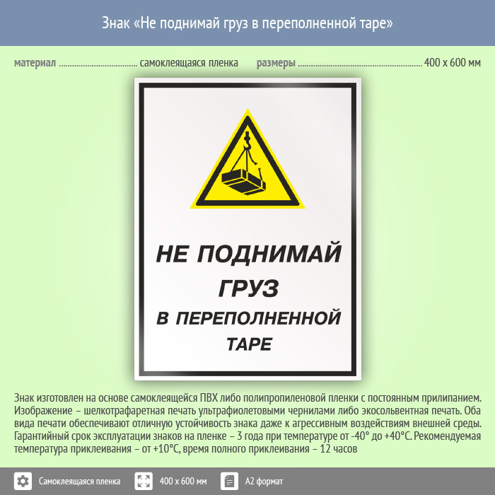 Знак «Не поднимай груз в переполненной таре», КЗ-26 (пленка, 400х600 мм) в Москве купить