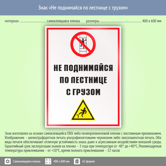 Знак «Не поднимайся по лестнице с грузом», КЗ-28 (пленка, 400х600 мм) в Москве купить