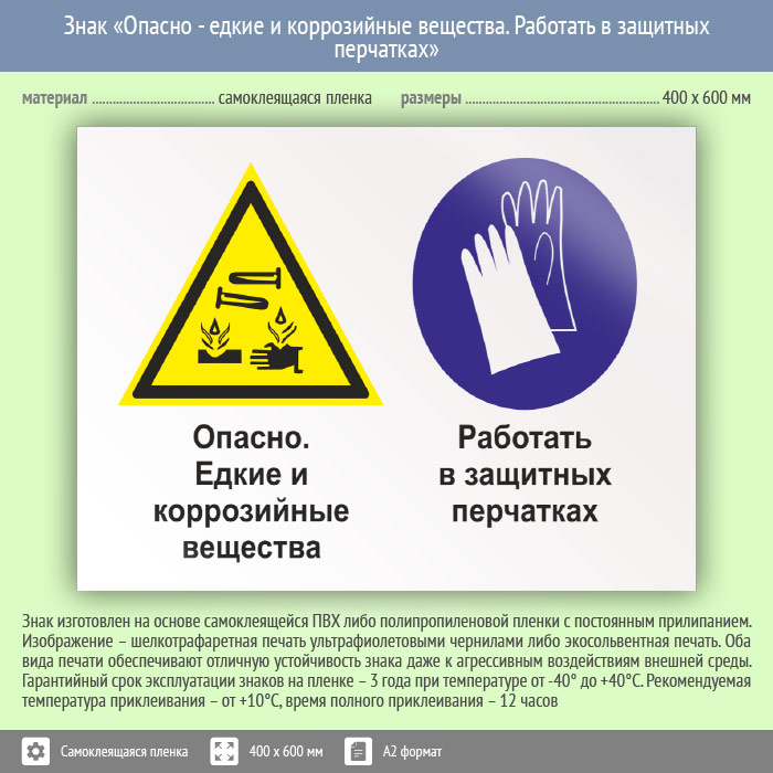 Знак «Опасно - едкие и коррозийные вещества. Работать в защитных перчатках», КЗ-36 (пленка, 600х400 мм) в Москве купить