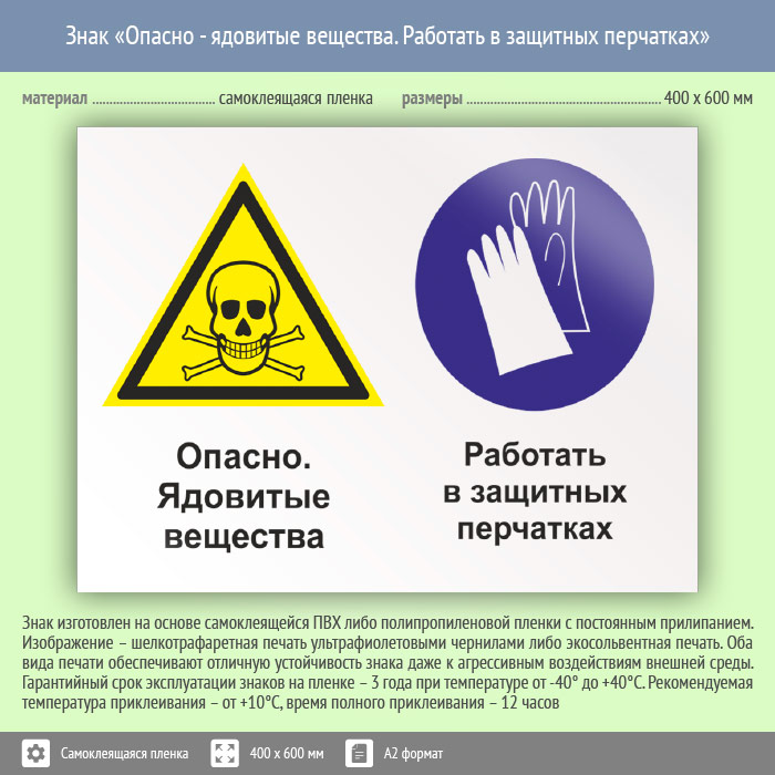 Знак «Опасно - ядовитые вещества. Работать в защитных перчатках», КЗ-43 (пленка, 600х400 мм) в Москве купить