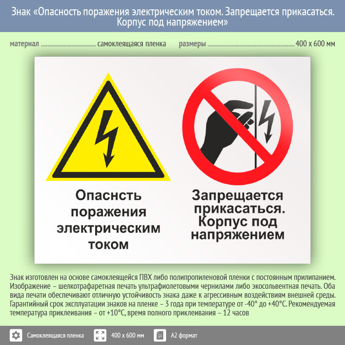 Знак «Опасность поражения электрическим током. Запрещается прикасаться. Корпус под напряжением», КЗ-47 (пленка, 600х400 мм) в Москве купить