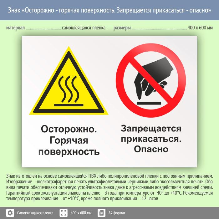 Знак «Осторожно - горячая поверхность. Запрещается прикасаться - опасно», КЗ-54 (пленка, 600х400 мм) в Москве купить