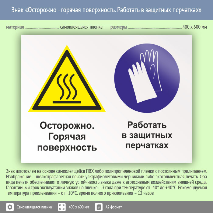 Знак «Осторожно - горячая поверхность. Работать в защитных перчатках», КЗ-55 (пленка, 600х400 мм) в Москве купить