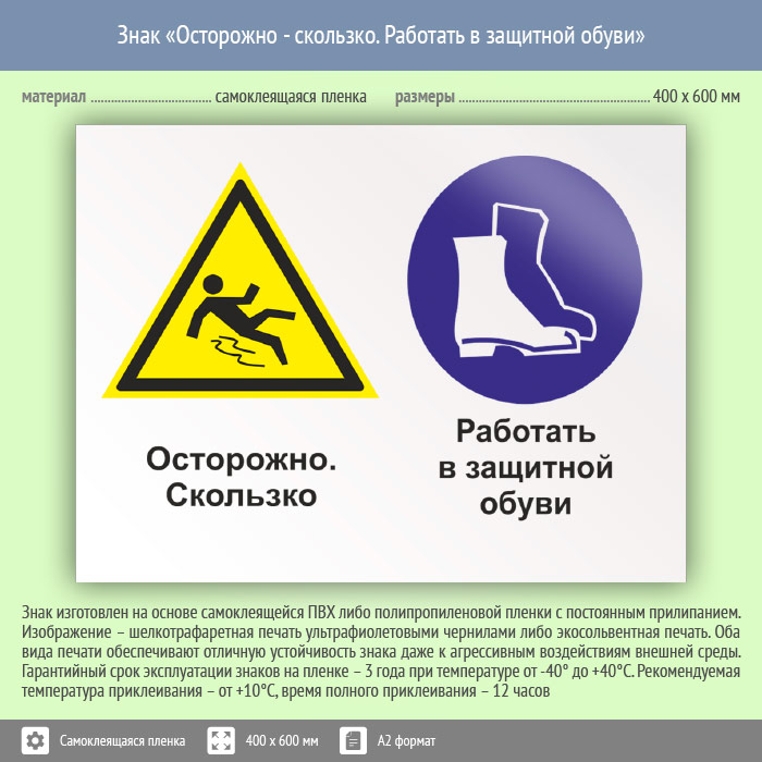 Знак «Осторожно - скользко. Работать в защитной обуви», КЗ-57 (пленка, 600х400 мм) в Москве купить