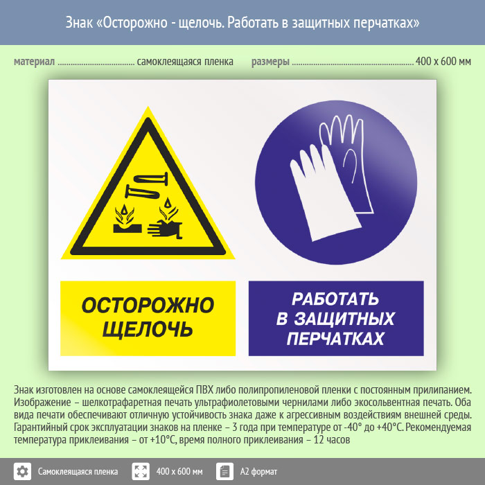 Знак «Осторожно - щелочь. Работать в защитных перчатках», КЗ-60 (пленка, 600х400 мм) в Москве купить