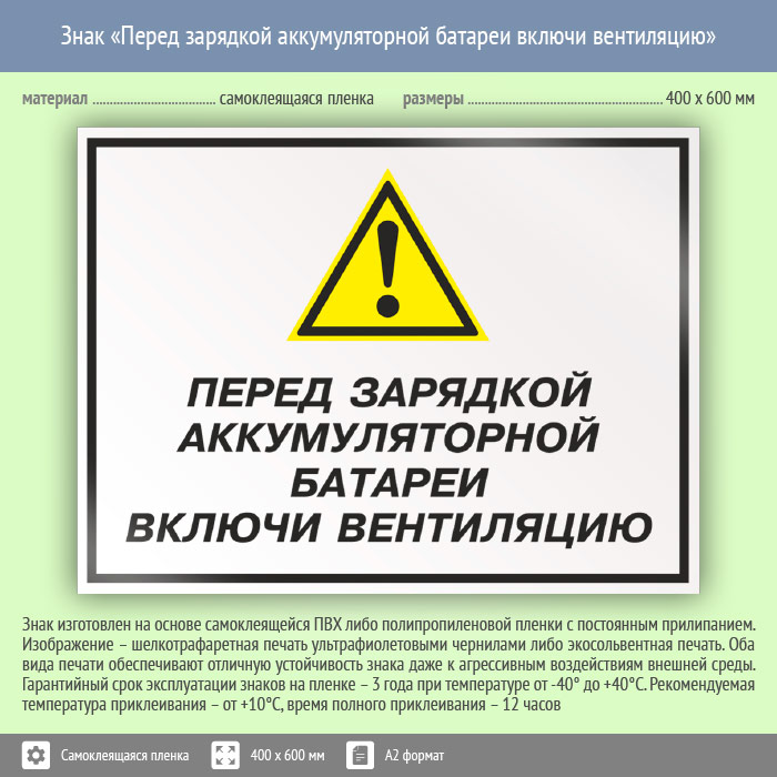 Знак «Перед зарядкой аккумуляторной батареи включи вентиляцию», КЗ-63 (пленка, 600х400 мм) в Москве купить