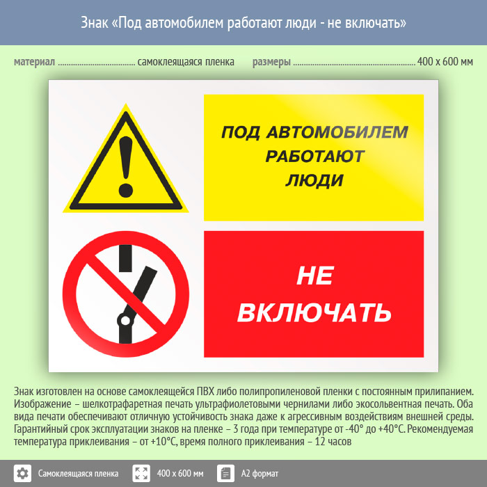Знак «Под автомобилем работают люди - не включать», КЗ-65 (пленка, 600х400 мм) в Москве купить