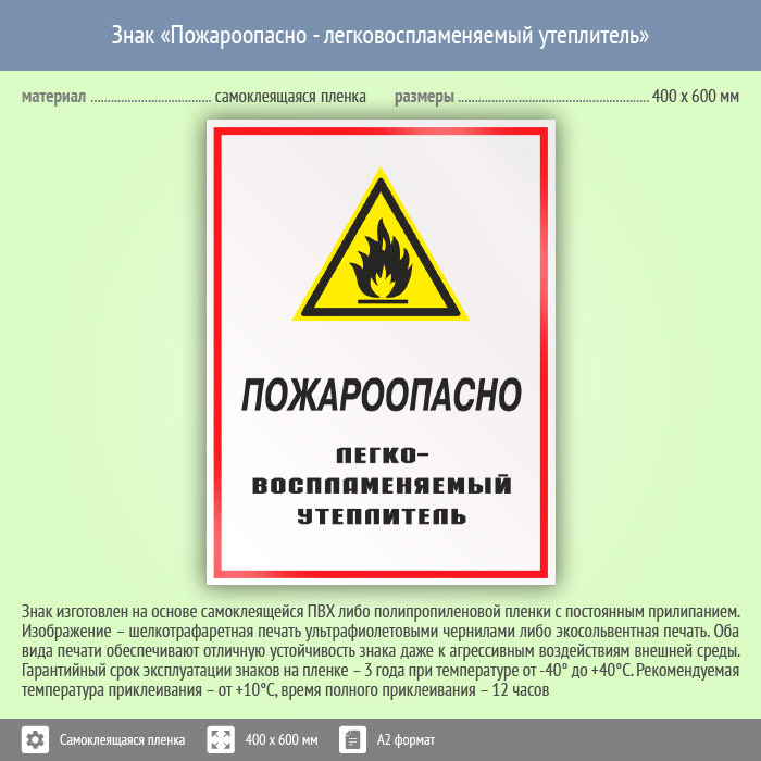 Знак «Пожароопасно - легковоспламеняемый утеплитель», КЗ-68 (пленка, 400х600 мм) в Москве купить