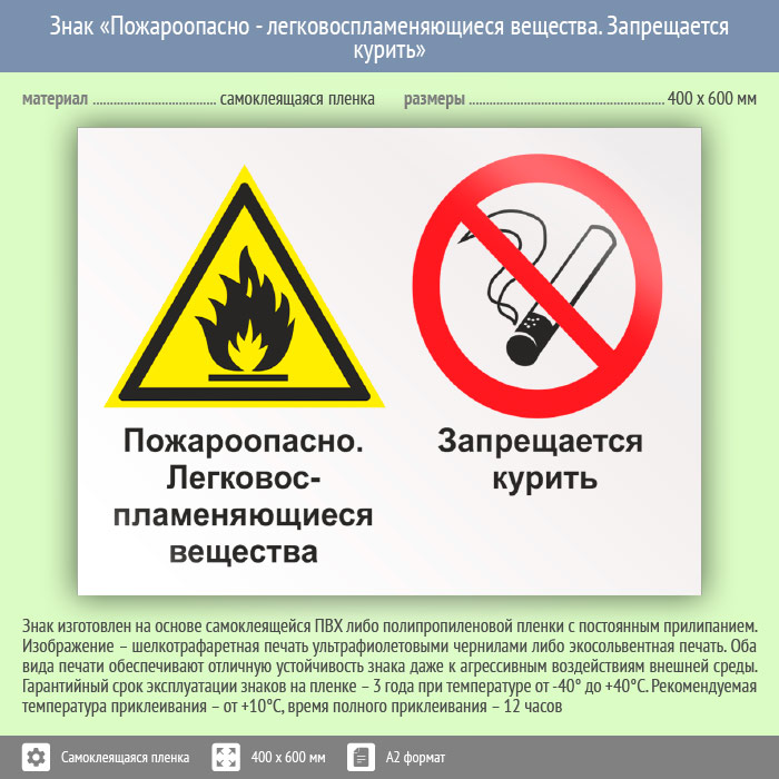 Знак «Пожароопасно - легковоспламеняющиеся вещества. Запрещается курить», КЗ-69 (пленка, 600х400 мм) в Москве купить