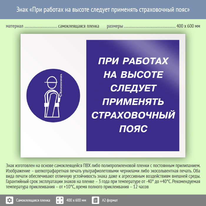 Знак «При работах на высоте следует применять страховочный пояс», КЗ-75 (пленка, 600х400 мм) в Москве купить