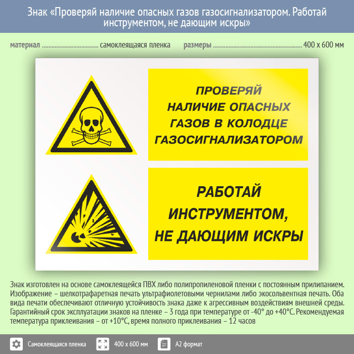 Знак «Проверяй наличие опасных газов газосигнализатором. Работай инструментом, не дающим искры», КЗ-77 (пленка, 600х400 мм) в Москве купить