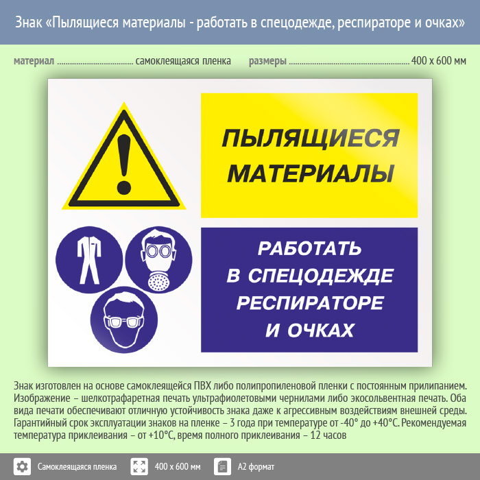 Знак «Пылящиеся материалы - работать в спецодежде, респираторе и очках», КЗ-79 (пленка, 600х400 мм) в Москве купить