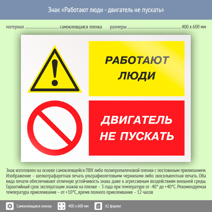 Знак «Работают люди - двигатель не пускать», КЗ-82 (пленка, 600х400 мм) в Москве купить