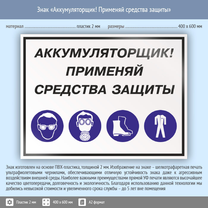 Знак «Аккумуляторщик! Применяй средства защиты», КЗ-02 (пластик, 600х400 мм) в Москве купить
