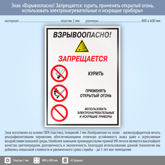 Знак «Взрывоопасно! Запрещается: курить, применять открытый огонь, использовать электронагревательные и искрящие приборы», КЗ-10 (пластик, 400х600 мм) в Москве купить