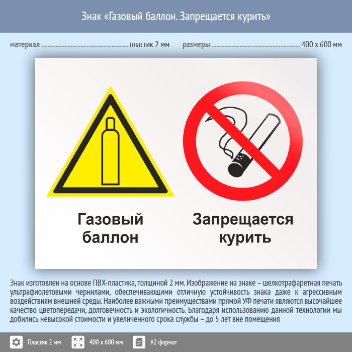 Знак «Газовый баллон. Запрещается курить», КЗ-18 (пластик, 600х400 мм) в Москве купить