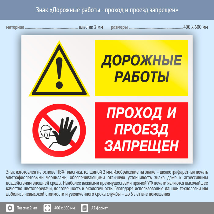 Знак «Дорожные работы - проход и проезд запрещен», КЗ-20 (пластик, 600х400 мм) в Москве купить