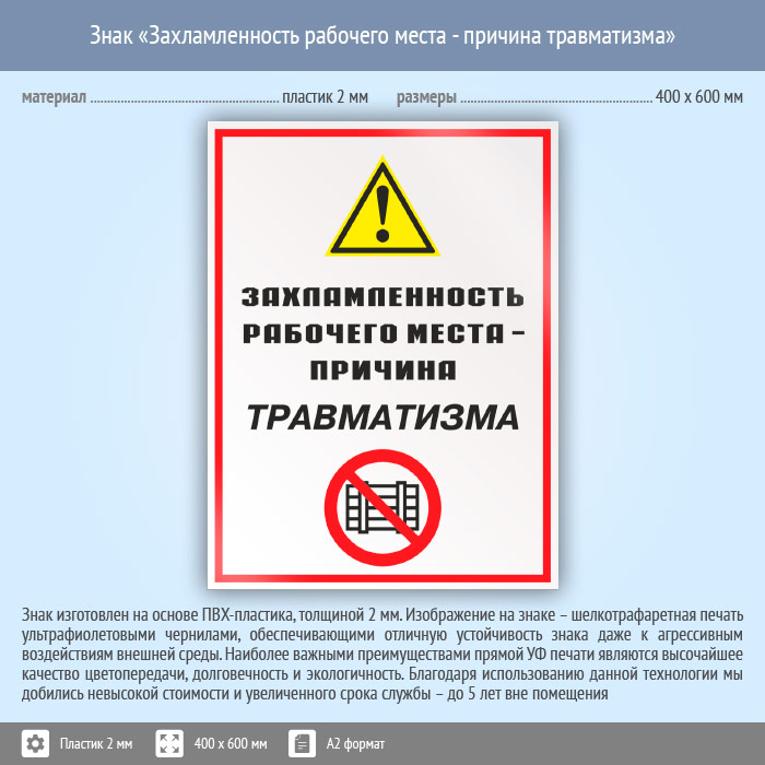 Знак «Захламленность рабочего места - причина травматизма», КЗ-21 (пластик, 400х600 мм) в Москве купить