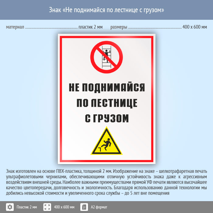 Знак «Не поднимайся по лестнице с грузом», КЗ-28 (пластик, 400х600 мм) в Москве купить