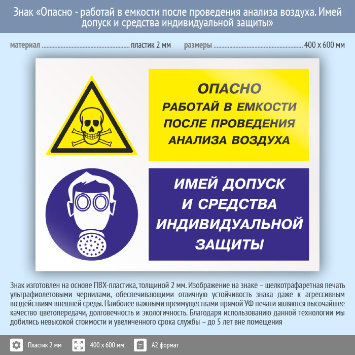 Знак «Опасно - работай в емкости после проведения анализа воздуха. Имей допуск и средства индивидуальной защиты», КЗ-39 (пластик, 600х400 мм) в Москве купить