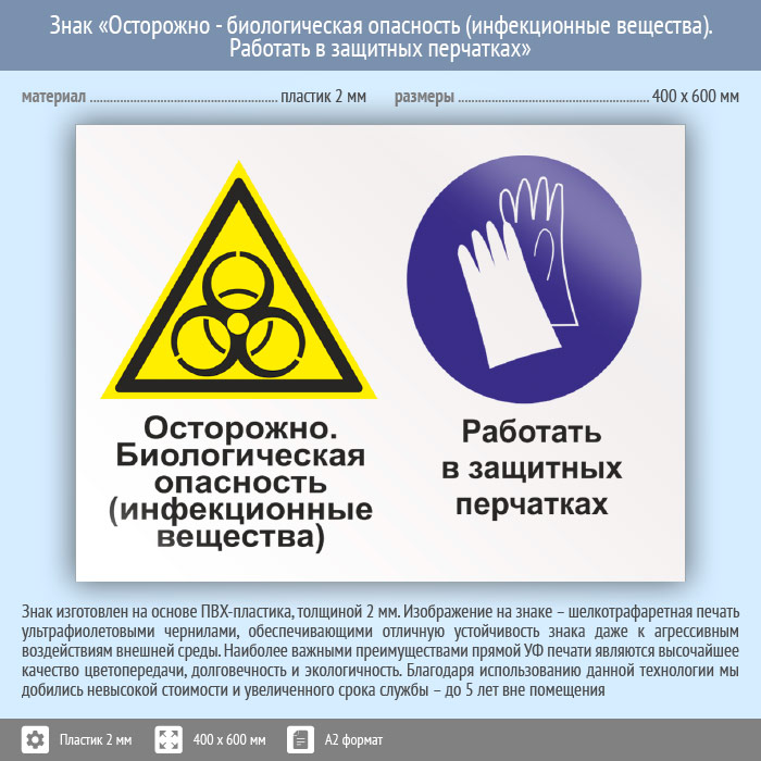 Знак «Осторожно - биологическая опасность (инфекционные вещества). Работать в защитных перчатках», КЗ-52 (пластик, 600х400 мм) в Москве купить