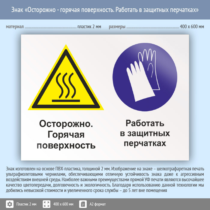 Знак «Осторожно - горячая поверхность. Работать в защитных перчатках», КЗ-55 (пластик, 600х400 мм) в Москве купить
