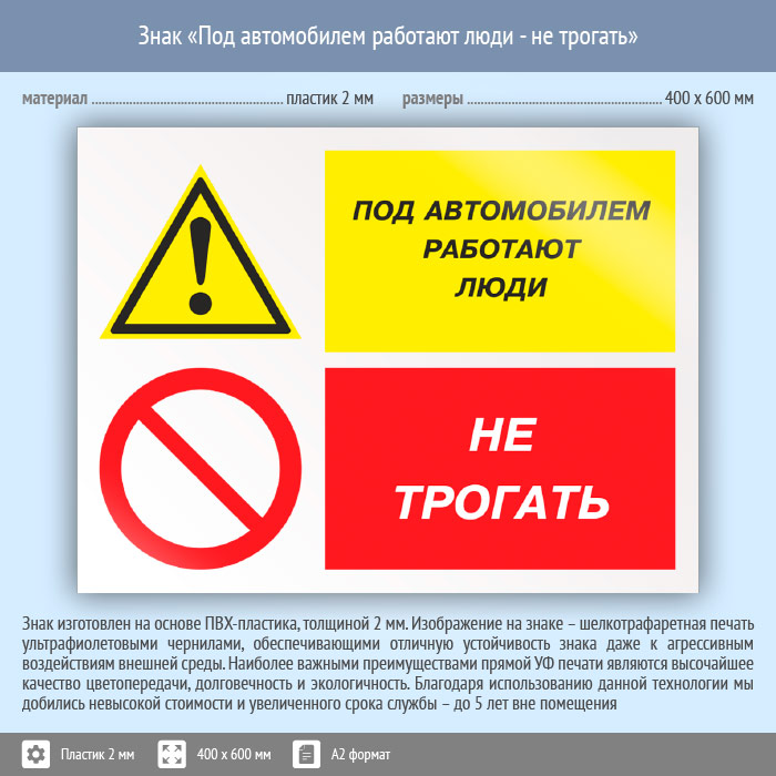 Знак «Под автомобилем работают люди - не трогать», КЗ-66 (пластик, 600х400 мм) в Москве купить