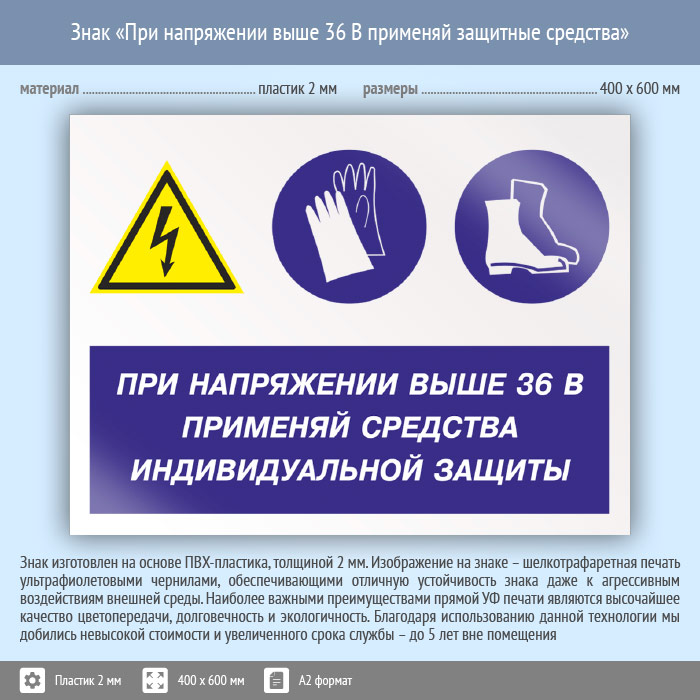 Знак «При напряжении выше 36 В применяй защитные средства», КЗ-71 (пластик, 600х400 мм) в Москве купить