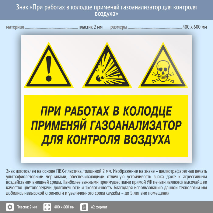 Знак «При работах в колодце применяй газоанализатор для контроля воздуха», КЗ-74 (пластик, 600х400 мм) в Москве купить
